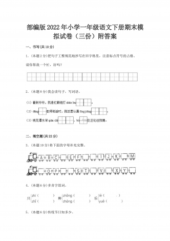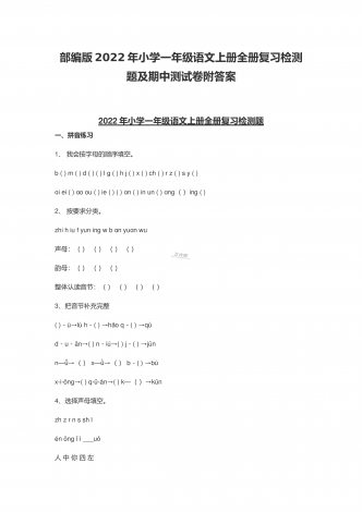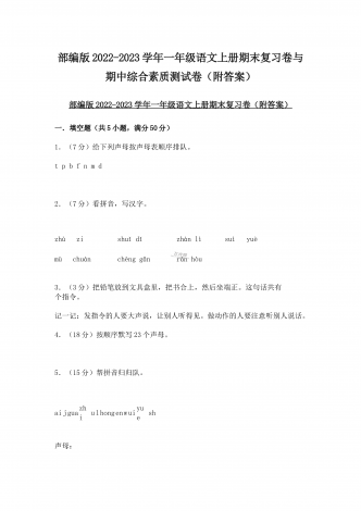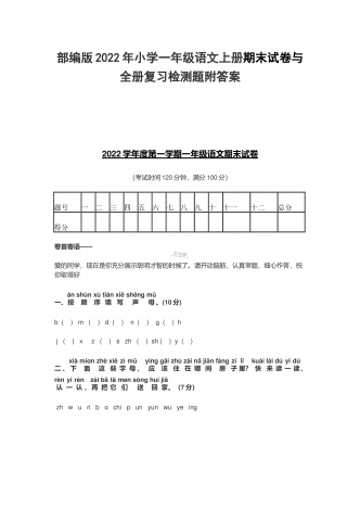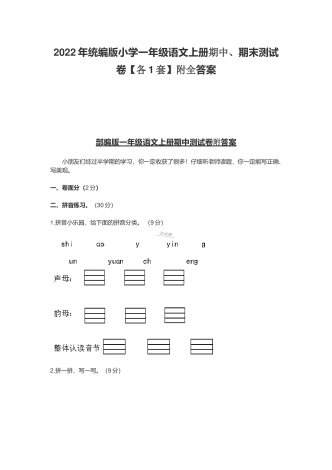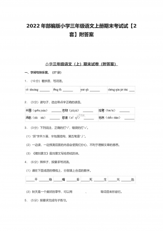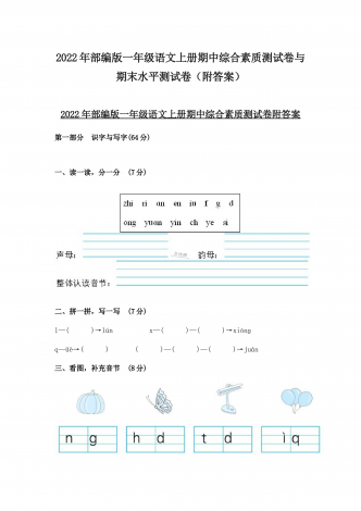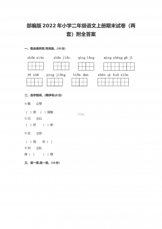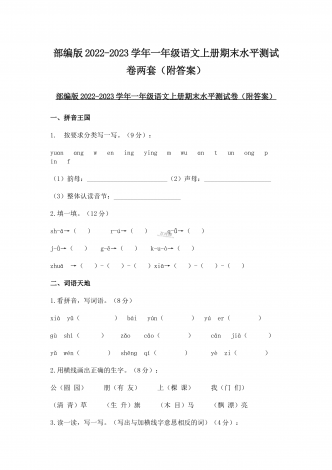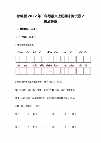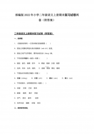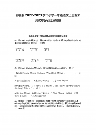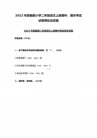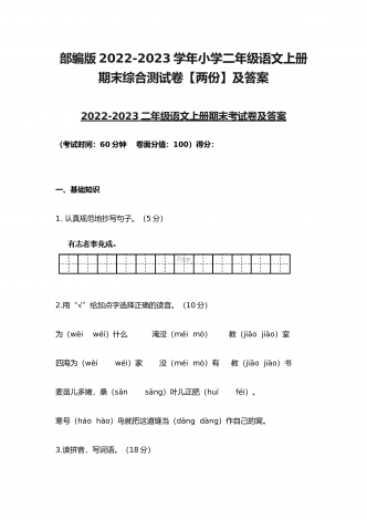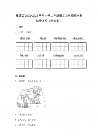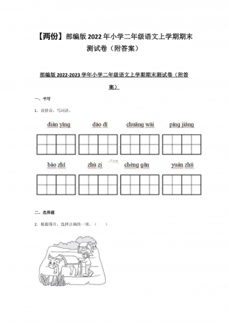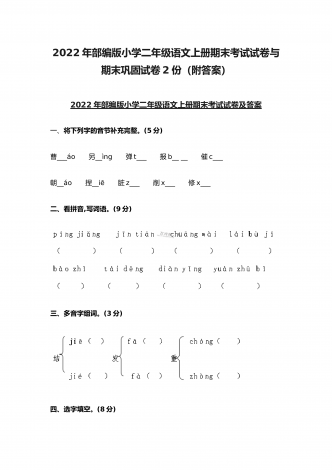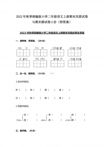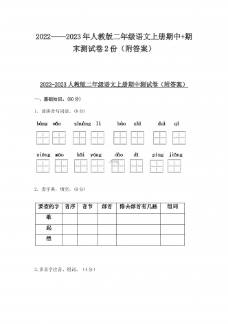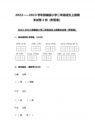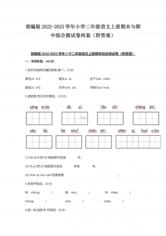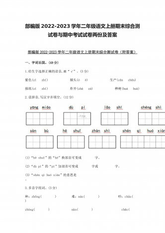 部编版2022-2023学年小学二年级语文上册期末与期中综合测试卷两套(附答案)部编版2022-2023学年小学二年级语文上册期末综合测试卷(附答案)一、字词乐园。(49分)1.给生字选择正确的读音,“√”画。(3分)紫色(zǐzh)ǐ额头(óé)生产(cnǎchn)ǎ报纸(zǐzh)ǐ炸开(zhàzà)桦树(huáhuà)2.读拼音,写汉字并填空。(12分)(1)“hēshu”ǐ“的hē”换部首可变成字。(2)“dùp픓的pí”加部首可变成字或字。(3)“shénqìh...