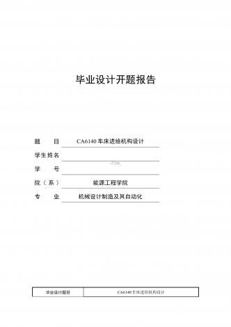毕业设计开题报告题目CA6140车床进给机构设计学生姓名学号院(系)能源工程学院专业机械设计制造及其自动化毕业设计题目CA6140车床进给机构设计1.本课题研究的意义CA6140型车床是普通精度级的万能卧式车床,它的特有功能是车削一定范围内的各种螺纹,包括切削公制螺纹、英制螺纹、模数螺纹和径节螺纹的功能,要求进给传动链的变速机构能严格准确地按照标准螺距数列来变化。CA6140型卧式车床进给机构位于车床进给箱(走刀箱),它固定在车床床身左前面,用于改变机床切削时的进给量或改变表面成形运动时刀具与工...