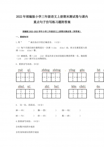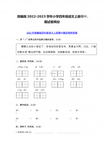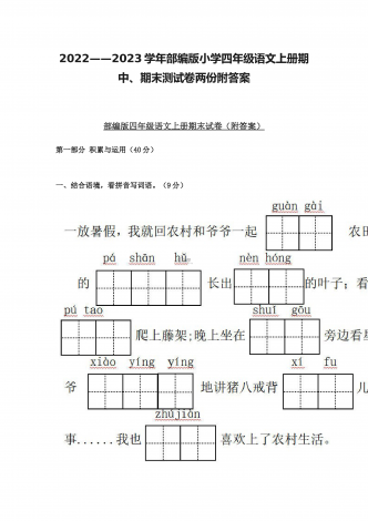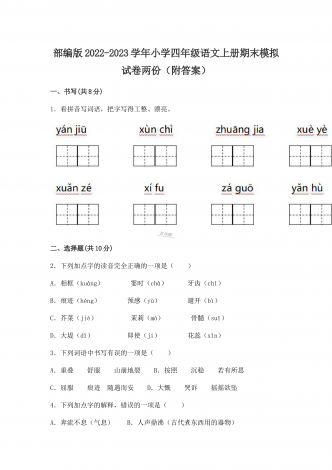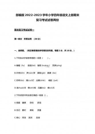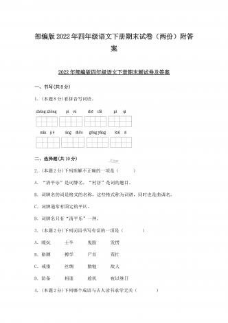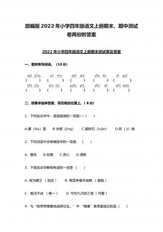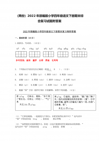 (两份)2022年部编版小学四年级语文下册期末综合复习试题附答案2022年部编版小学四年级语文下册期末复习卷附答案一、基础积累(45分)1.读拼音,写词语。(10分)2.,下列加点字读音完全正确的一组是( B ,)。(3分)A.,疙瘩(da) B.譬如(pì) C.奢侈(chí) D.啄食(zhuó)B.,赤脚(chì) B.晕皱(yùn) C.徜徉(cháng) D.余晖(huī)C.,栖息(qī) B.松懈(jiè) C.抡拳(lūn) D.麦秆(gǎn),3.,根据“屏”字在《新华字典》中...