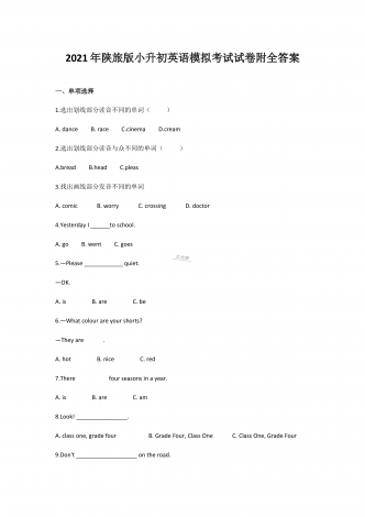 2021年陕旅版小升初英语模拟考试试卷附全答案一、单项选择1.选出划线部分读音不同的单词( ) A. dance B. race C.cinema D.cream2.选出划线部分读音与众不同的单词( ) A.bread B.head C.pleas3.找出画线部分发音不同的单词 A. comic B. worry C. crossing D. doctor4.Yesterday I ______to school. A. go B. went...