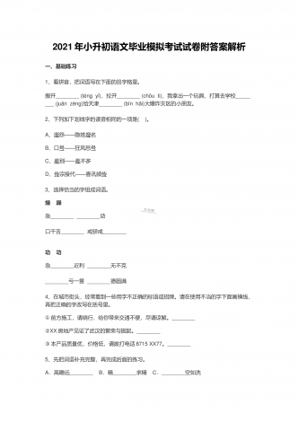 2021年小升初语文毕业模拟考试试卷附答案解析一、基础练习1、看拼音,把词语写在下面的田字格里。搬开________(téng y)ǐ,拉开________(chōu ti),我拿出一个玩具,打算去学校________(juān zèng)给天津________(bīn hi)ǎ大爆炸灾区的小朋友。 2、下列加下划线字的读音相同的一项是( )。 A、埋——怨隐姓埋名B、口号——狂风怒号C、差——别差不多D、传——宗接代喜讯频传3、选择恰当的字组成词语。燥 躁急___...