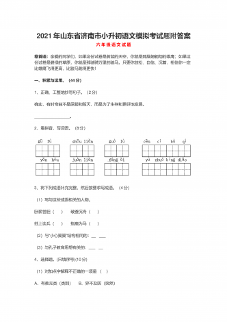 2021年山东省济南市小升初语文模拟考试题附答案六年级语文试题卷首语:亲爱的同学们,如果这份试卷是蔚蓝的天空,你就是那展翅翱翔的雄鹰;如果这份试卷是碧绿的草原,你就是那驰骋万里的骏马。只要你放松、自信、沉着,相信你一定比雄鹰飞得更高,比骏马跑得更快!一、积累与运用。(44分)1、正确、工整地抄写句子。(2分)确实,有时弯曲不是屈服和毁灭,而是为了生存和更好地发展。 。2、看拼音,写词语。(8分)3、将下列成语补充完整,然后按要求写成语...