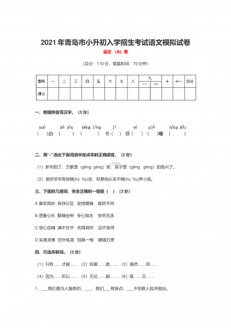 2021年青岛市小升初入学招生考试语文模拟试卷语文(A)卷(总分:110分,答题时间:70分钟)一、根据拼音写汉字。(5分)“√”二、用选出下面词语中加点字的正确读音。(2分)(1)新年到了,万象更(gēng gèng)新,孩子更(gēng gèng)加高兴了。(2)虽然爷爷有些糊(hù hú)涂,但是他从来不糊(hú hù)弄小孩。三、下面的几组词,完全正确的一组是( )(3分)A莫名其妙 各抒己见 发愤图强 载然不同B语重心长 聚精会神 专心致志 安然无恙C惊心动魂 满不在...