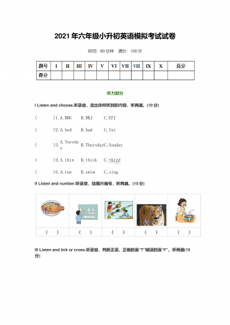 2021年六年级小升初英语模拟考试试卷时间:60分钟 满分:100分听力部分IListenandchoose.听录音,选出你所听到的内容,听两遍。(10分)( )1.A.BDGB.DBJC.EFJ( )2.A.bedB.badC.fat( )3.A.TuesdayB.ThursdayC.Sunday( )4.A.thinB.thickC.third( )5.A.runB.swimC.singIIListenandnumber.听录音,给图片编号,听两遍。(10分)IIILi...