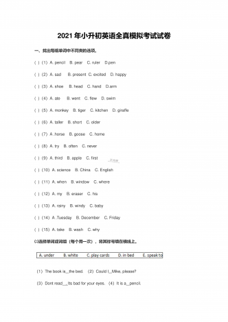 2021年小升初英语全真模拟考试试卷一、找出每组单词中不同类的选项。()(1)A.pencilB.pearC.rulerD.pen()(2)A.sadB.presentC.excitedD.happy()(3)A.shoeB.headC.handD.arm()(4)A.ateB.wentC.flewD.swim()(5)A.monkeyB.tigerC.kitchenD.giraffe()(6)A.tal...
