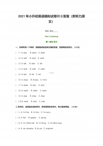 2021年小升初英语模拟试卷附全答案(附听力原文)姓名 得分 PartIListening第一部分听力一、你将听到一个单词,请根据读音选择正确的答案,答案填在括号内。(10分)( ) 1. A. play B. plane C. plate( ) 2. A. wait B. want C. what( ) 3. A. talk B. take C. tell( ) 4. A. work B. walk C. wake( ) 5. A...