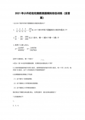 2021年小升初名校奥数真题模拟综合训练(含答案)1.这239个数中所有不是整数的分数的和是多少? 这两个分数相比,哪一个更大?4.把从1到100的所有整数相乘,在乘积的末尾有多少个零?5.小克林顿做家务每天可得3美元,做得特别好时每天可得5美元,有1个月(30天)他共得100美元,这个3月他有多少天做得特别好?6.如果整数同时具备以下性质:(1)这个数与1的差是质数;(2)这个数除以2所得的商也是质数;(3)这个数除以9所得的余数是5.我们称这个整数为幸运数.那么,在两位数中,最大的幸运数是几...