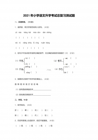 2021年小学语文升学考试总复习测试题一、汉语拼音。(10分)1、读拼音,将汉字规范地写入括号。(4分) zǔ náo kāng kiǎ máo dùn dàn shēng( ) ( ) ( ) ( ) wǔ rǔ xingǎ shòu lǜ xíng nunǎ kàng( ) ( ) ( ) ( )2、给句子中加点的字选择正确的音节,在正确的读音括号里面打(V)(2分)3、按要求分别将下列字写在横线上。(4分)勘 锦 橙 烘 琨 拧 妨 惩 蝇(1)韵母...