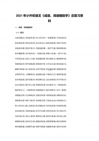 2021年小升初语文《成语、词语错别字》总复习资料一、成语、词语错别字(一)复习沾轻怕重(拈)名列前矛(茅)岂人忧天(杞)一愁莫展(筹)汗流夹背(浃)按步就班(部)有持无恐(恃)风云变幼(幻)挺而走险(铤)甘败下风(拜)自抱自弃(暴)穿流不息(川)天翻地复(覆)一股作气(鼓)悬梁刺骨(股)食不裹腹(果)迫不急待(及)一如继往(既)草管人命(菅)一诺千斤(金)不径而走(胫)烩炙人口(脍)死皮癞脸(赖)鼎立相助(力)黄梁美梦(粱)再接再励(厉)默守成规(墨)...
