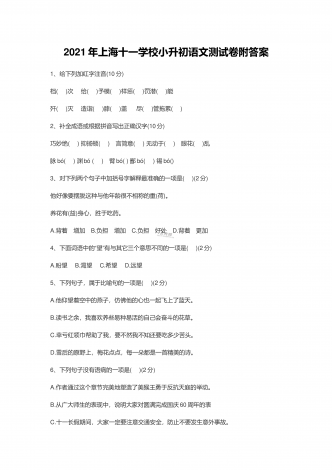 2021年上海十一学校小升初语文测试卷附答案1、给下列加红字注音(10分) 档( )次 给( )予模( )样惩( )罚潜( )能歼( ) 灭 造诣( )膝( )盖 尽( )管拖累( )2、补全成语或根据拼音写出正确汉字(10分)巧妙绝( ) 抑扬顿( ) 言简意( ) 无动于( ) 眼花( )乱脉bó( ) 渊bó ( ) 臂bó( ) 鄙bó( ) 锡bó()3、对下列两个句子中加括号字解释最准确的一项是( )(2分)他好像要摆脱这种与他年龄很不相称...