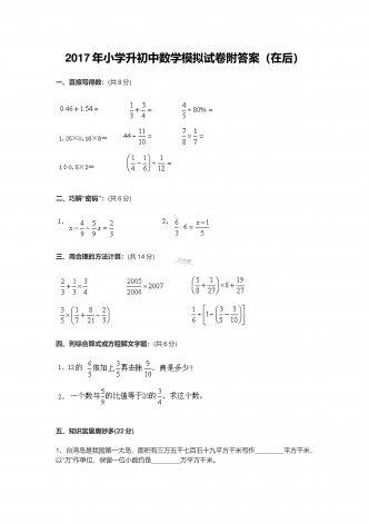 2017年小学升初中数学模拟试卷附答案(在后)一、直接写得数:(共8分)“”二、巧解密码:(共6分)三、用合理的方法计算:(共14分)四、列综合算式或方程解文字题:(共6分)五、知识宫里奥妙多(22分)1、台湾岛是我国第一大岛,面积有三万五千七百五十九平方千米写作________平方千米,“”以万作单位,保留一位小数约是________万平方千米。2、800平方米=________ 公顷2.25小时=________小时________分 ________比4多25% 2...