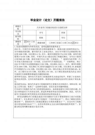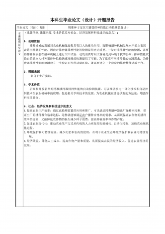 本科生毕业论文(设计)开题报告毕业论文(设计)题目精准种子定位穴播器排种性能自动检测装置设计本课题的研究意义(选题依据,课题来源,学术价值及对社会、经济发展和科技进步的意义):1、选题依据播种机械的发展对农业机械化进程具有巨大的推动作用,而影响播种机械发展水平的主要因素是掛种器的性能,因此对排种器排种性能的检测显得光为重要。一般对排种器性能的检测,需要将排种器安装在播种机械上进行大田试验,这既浪费时间又容易受到环境干扰的影响。排种性能试验台的建立为排种器排种性能快速准确的检测提供了可能。为了适应...