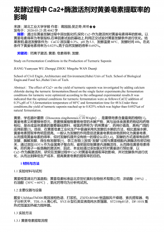 发酵过程中Ca2+酶激活剂对黄姜皂素提取率的影响来源:湖北工业大学学报作者:蒋园园;吴正奇;周明��发布于:2020-03-23共4042字 摘要:通过在黄姜发酵过程中添加氯化钙,探究Ca2+作为激活剂对黄姜皂素得率的影响。以黄姜皂素得率为考察指标,在单因素试验的基础上,利用正交试验对黄姜发酵条件进行优化。结果表明,最适发酵条件为:CaCl2添加量0.3%、pH为5.5、发酵温度60℃、发酵时间48h。在此条件下黄姜皂素得率为0.825%,高于自然发酵的得率0.692%。 关键词:钙离子激活;黄...