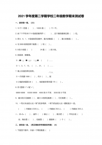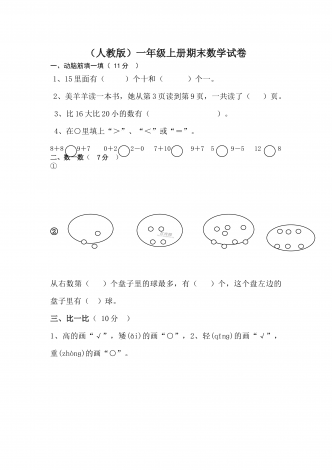 2021年小学一年级数学经典奥数题100道汇编1.哥哥4个苹果,姐姐有3个苹果,弟弟有8个苹果,哥哥给弟弟1个后,弟弟吃了3个,这时谁的苹果多?2.小明今年6岁,小强今年4岁,2年后,小明比小强大几岁?3.同学们排队做操,小明前面有4个人,后面有4个人,这一队一共有多少人?4.有一本书,小华第一天看了2页,以后每一天都比前一天多看2页,第4天看了多少页?5.同学们排队做操,从前面数,小明排第4,从后面数,小明排第5,这一队一共有多少人?6.有8个皮球,如果男生每人发一个,就多2个,如果女生每人发...