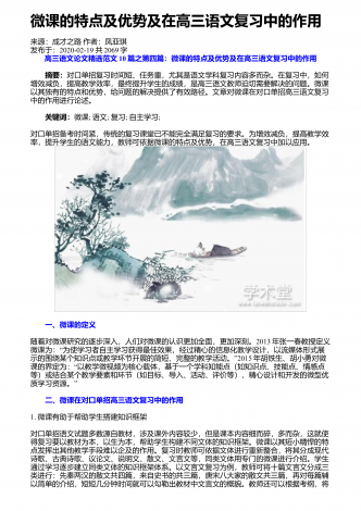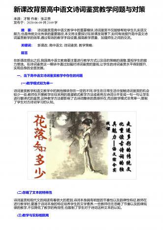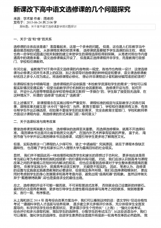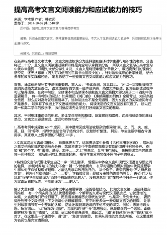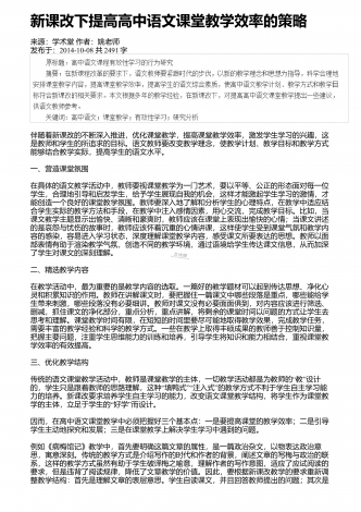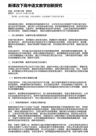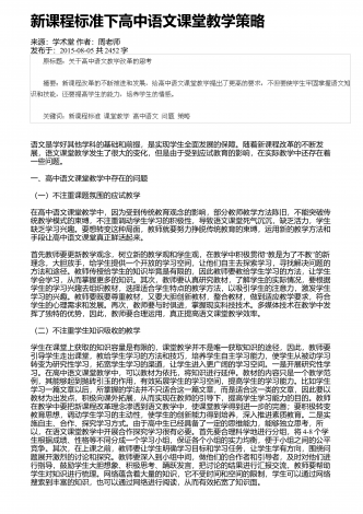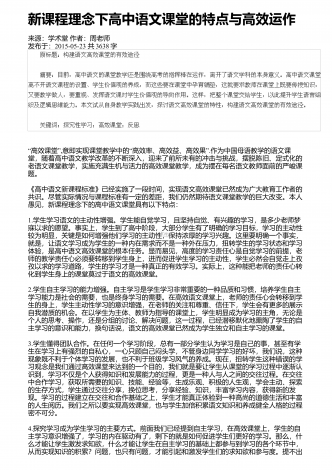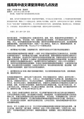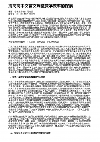 提高高中文言文课堂教学效率的探索来源:学术堂作者:周老师发布于:2014-11-27共3869字内容提要:文言文教学肩负着传承传统文化,延续国学精粹的任务,具有既深刻严肃又丰富生动的特点,可在以往的文言文教学中,我们只注重了它深刻的一面而忽视了它丰富多采的一面,只注重了它严肃的一面而忽视了它生动活泼的一面,因而使学生对文言文的学习产生退缩、畏难、回避的情绪,从而影响整个课堂教学效果.然而新的《课程标准》要求我们"高中语文课程必须充分发挥自身的优势,弘扬和培育民族精神,使学生受到优秀文化的熏陶,塑...