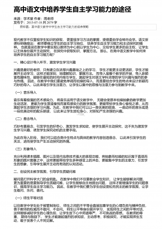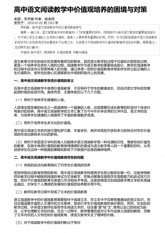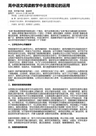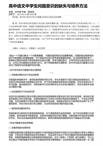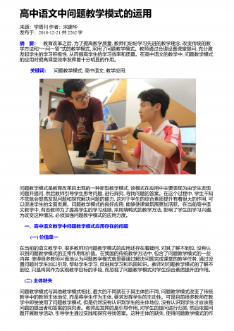 高中语文中问题教学模式的运用来源:学周刊作者:宋建华发布于:2018-12-21共2262字摘 要:教育改革之后,为了提高教学质量,教师们纷纷学习先进的教学理念,改变传统的教“”学方法和一问一答式的教学模式,采用了问题教学模式。教师通过合理设置课堂提问,充分激发起学生的学习积极性,从而提高学生的学习效率和质量。在高中语文的教学中,问题教学模式的应用对提高课堂效率发挥着十分明显的作用。 关键词:问题教学模式;高中语文;教学应用;问题教学模式是教育改革后出现的一种新型教学模式,该模式在应...
