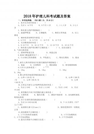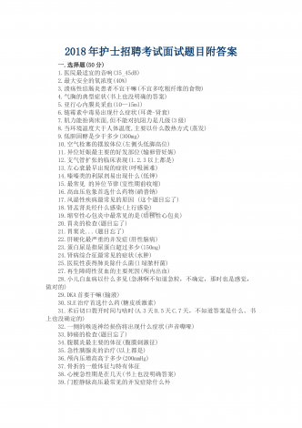 2018年护士招聘考试面试题目附答案 一.选择题(50分) 1.医院最适宜的音响(35_45dB) 2.最大安全的氧浓度(40%) 3.溃疡性结肠炎患者不宜干嘛(不宜多吃粗纤维的食物) 4.气胸的典型症状(书上也没明确的答案) 5.亚行心内膜炎采血(10—15ml) 6.链霉素中毒易出现什么症状(耳聋-肾衰) 7.肌力能抬离床面,但不能对抗阻力是几级(3级) 8.当环境温度大于人体温度,主要以什么散热方式(蒸发) 9.低胆固醇是少于多少(300mg) 10.空气栓塞的摆放体...