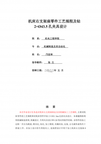 机床右支架座零件工艺规程及钻2ר43.5孔夹具设计院系:机电工程学院专业:机械制造及其自动化姓名:邝宏林指导教师:张兰答辩日期:二〇二二年五月摘要本次毕业设计任务是对机床右支架座制定及其机械加工工艺规程,主要对机床零件的工艺规程和对机床零件中钻2ר43.5mm孔的夹具设计。本课题图将利用机械制造原理,机械设计,专用夹具设计和CAD等应用软件绘制。该零件的加工过程一共分为铣面,镗内孔,钻孔,加工精度,攻螺丝扣,反角,去毛刺形成等共十四道工序。在加工设计的专用装夹上,是按照设计中用于加工机床右支...