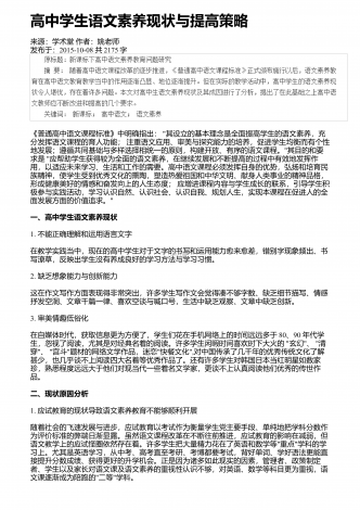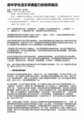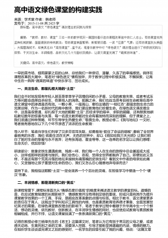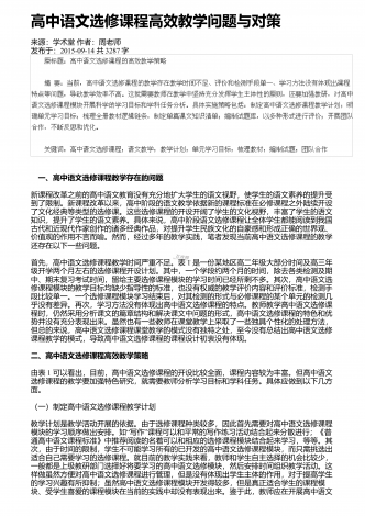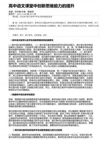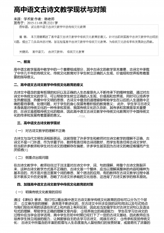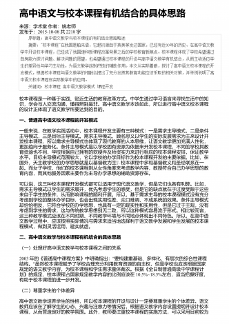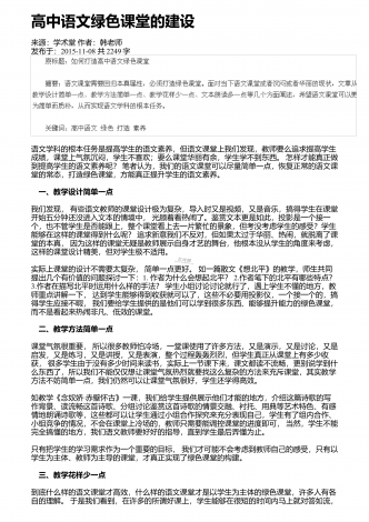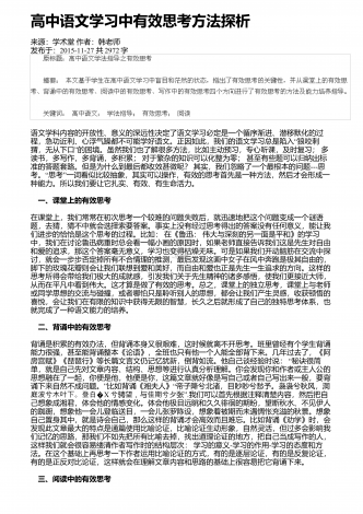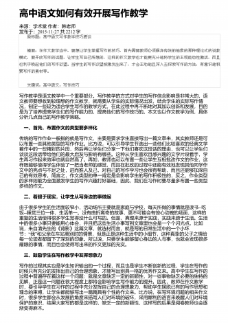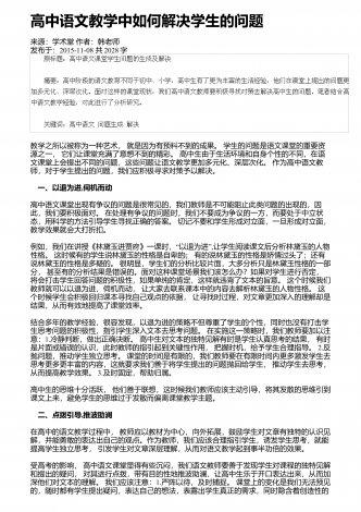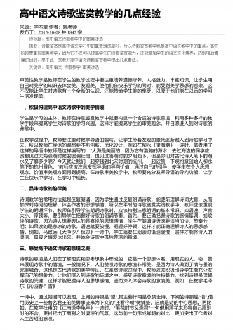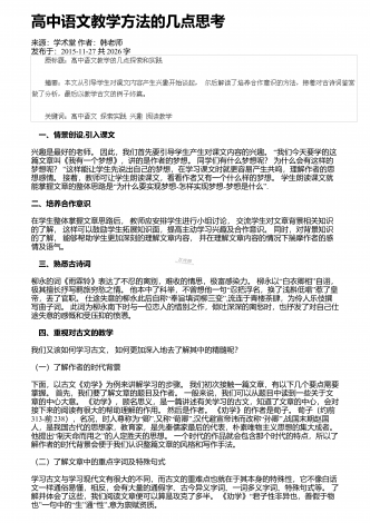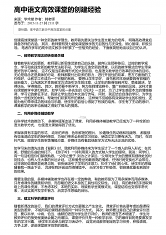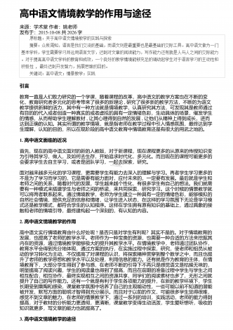 高中语文情境教学的作用与途径来源:学术堂作者:姚老师发布于:2015-10-08共2026字引言教育一直是人们致力研究的一个学课,随着课程的改革,高中语文的教学方案也在不断的变化,教育研究者多元化的思考带来了很多的新理论,研究了很多新的教学方法,不断的为语文教学提供新鲜的活力,其中有一种方法就是情境教学,认真研究其方法,可发现其是教师通过有目的的代入或者创造一种真实的或者虚拟的具有一定情绪色彩,生动具体的场景,催发学生的情感,从而帮助学生理解教材,让其心理得到自然的发展,让他们从精神上得到成长,...
