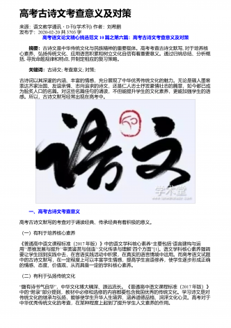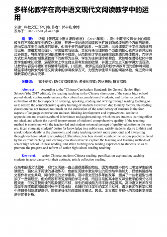 高中学生诗歌鉴赏能力提升路径来源:学周刊作者:王永胜发布于:2019-08-09共2073字浅谈高中语文诗歌教学摘要:高中的语文学习中,诗歌鉴赏占重要一部分,由于诗歌本身的语言特点,诗歌鉴赏也是学生学习的一个主要难点。那么,如何学好诗歌鉴赏,本文将进行简单的探究:首先,我们都知道诗歌中有很多文言文的元素,而且本身具有抽象性,所以,要想做好诗歌鉴赏,就要读懂诗歌,这就要求打好文言文基础;其次,学生要走进诗歌描绘的意境,这就要求学生具有一定的文学素养;最后,学生要加强自主学习,多读多看,培养一定的诗...