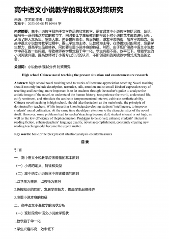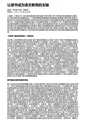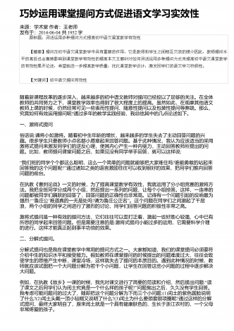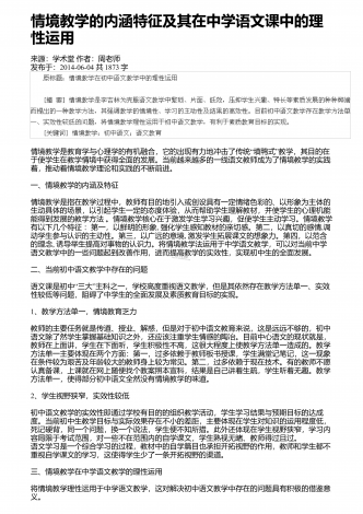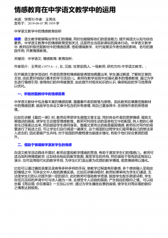 情感教育在中学语文教学中的运用来源:学周刊作者:王秀花发布于:2019-08-07共1959字中学语文教学中的情感教育剖析摘要:语文教学能够陶冶学生们的情操,同时也能锻炼他们的语言能力,提升其语文认知与综合素养。中学语文教育中的情感教育受到关注,这是符合当前新课标的具体行动。中学语文教学中,教师应积极挖掘教材中的情感因素,借助情境教学、时代背景及作者信息的影响、名句的激励作用,开展情感教育。关键词:中学语文;情感教育;教育剖析;作者简介:王秀花(1975.4—),女,汉族,甘肃定西人,一级教师,...