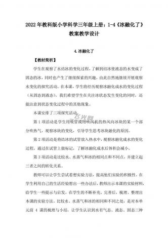 2022年教科版小学科学三年级上册:1-4《冰融化了》教案教学设计
