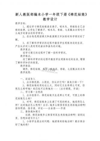 新人教版部编本小学一年级下册《棉花姑娘》教学设计