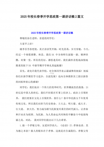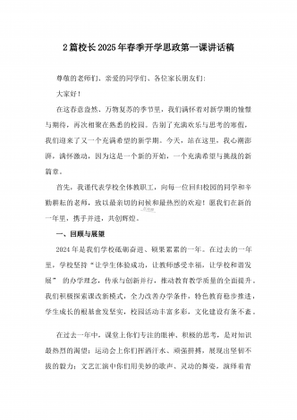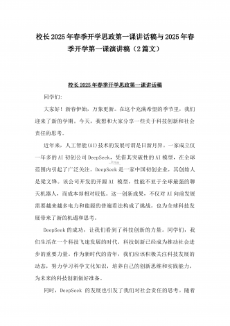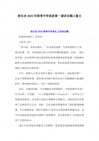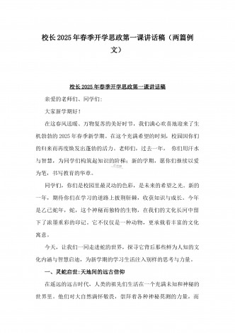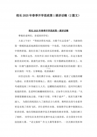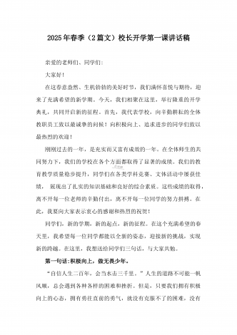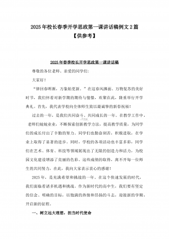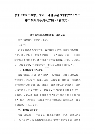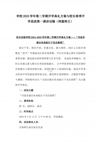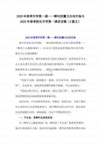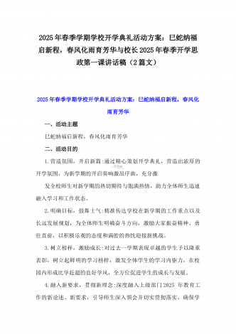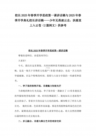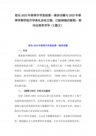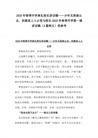 2025年春季开学典礼新闻稿:少年无畏凌云志,扶摇直上入云苍与开学典礼活动方案【哪吒版】少年无畏凌云志,扶摇直上入云苍(2篇文)供参考2025年春季开学典礼新闻稿:少年无畏凌云志,扶摇直上入云苍2025年2月17日,我校隆重举办了主题为“少年无畏凌云志,扶摇直上入云苍”的春季开学典礼。全校师生、家长代表和校领导齐聚在校园内,共同见证了这一激励人心的盛会。现场空气中洋溢着希望与活力,每个人脸上都写满了对新学期的期待与憧憬。校门口早已布置得焕然一新。精心装饰的“灵珠门”上悬挂着莲花和祥云图案,寓意着...