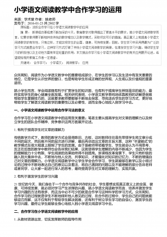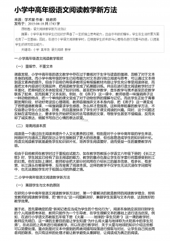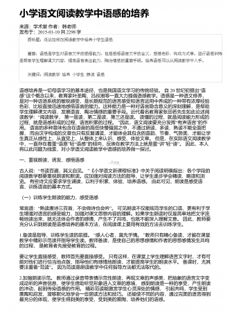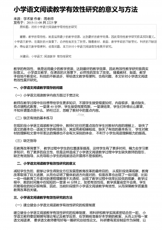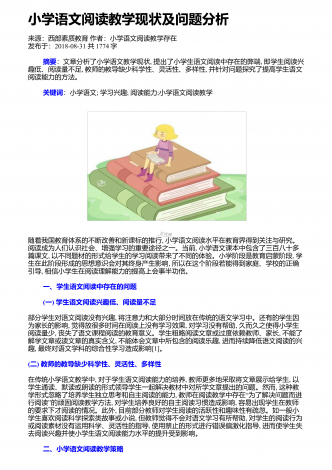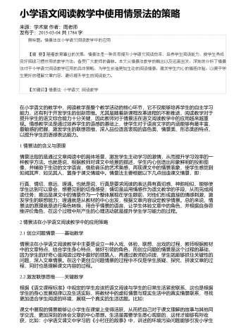 小学语文阅读教学中情景教学的应用来源:学周刊作者:朱玉君发布于:2020-04-07共3809字 摘 要:阅读是语文科目中最重要的内容之一,其可以有效提升学生对语言的理解和使用,也会直接影响到学生的学习质量,因此提高学生的阅读能力是小学教育中的重点。当前的阅读教学,在教学方式、考查、学校等方面存在着一些问题。情境教学法的合理运用,能激发学习兴趣,促进情感体验,提高教学效率。在教学中,教师要创设生活情境激发阅读热情,创设音乐情境培养阅读兴趣,创设语言情境提高想象能力,创设表演情境促进多元发...