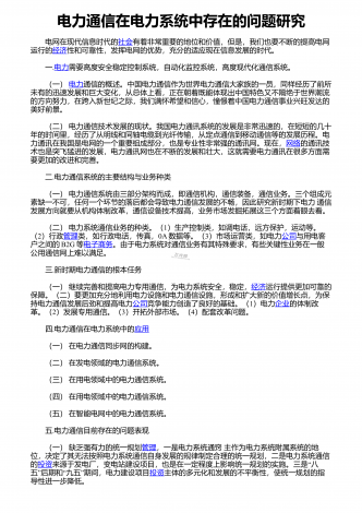电力通信在电力系统中存在的问题研究 电网在现代信息时代的社会有着非常重要的地位和价值,但是,我们也要不断的提高电网运行的经济性和可靠性,发挥电网的优势,充分的适应现在信息发展的时代。 一.电力需要高度安全稳定控制系统,自动化监控系统,高度现代化通信系统。 (一)电力通信的概述。中国电力通信作为世界电力通信大家族的一员,同样经历了前所未有的迅速发展和巨大变化,从总体上看,正在朝着既能体现出中国特色又不隔绝于世界潮流的方向努力,在跨入新世纪之际,我们满怀希望和信心,憧憬着中国电力通信事业兴旺...