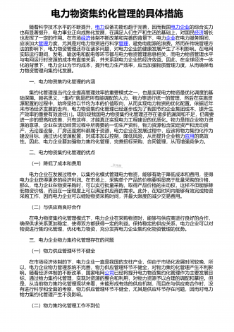 电力物资集约化管理的具体措施 随着科学技术水平的不断提升,电力设备功能也趋于完善,因而我国电力 企业 的综合实力也有显著提升,电力事业正向成熟化发展,在满足人们生产和生活的基础上,对国民经济增长也发挥了一定的作用。在市场经济体制不断改革和完善的背景下,电力企业在电力服务期间,应该加大管理力度,尤其是对电力物资进行科学管理,避免电能源的浪费。然而在传统管理方法的影响下,电力物资管理还存在诸多问题,对电力企业的健康发展产生了不利影响。在电网实际运行期间,发电、输送电和配电等环节都与电力物资管理...