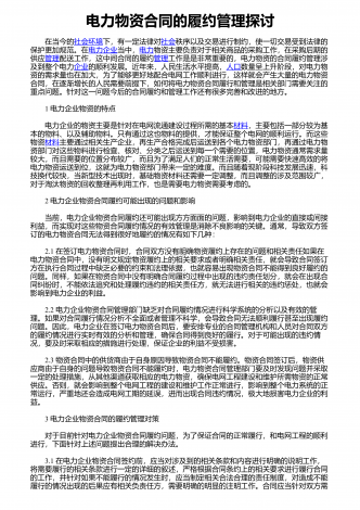 电力物资合同的履约管理探讨 在当今的社会 环境 下,有一定法律对社会秩序以及交易进行制约,使一切交易受到法律的保护更加规范。在电力 企业 当中,电力物资主要负责对于相关商品的采购工作,在采购后期的供应管理配送工作,这中间合同的履约管理工作是是非常重要的,电力物资的合同履约管理涉及到整个电力企业的顺利发展。近年来,人民生活水平提高,人口数量呈上升阶段,对电力物资的需求量也在加大,为了能够更好地配合电网工作顺利进行,这样就会产生大量的电力物资合同,在逐渐增长的人民需要前提下,如何将电力物资...