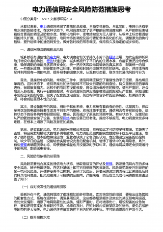 电力通信网安全风险防范措施思考 中图分类号:TN915 文献标识码:A 从现状来看,电力通信网拓展了覆盖的总规模,日渐变得复杂。与此同时,电网也含有更高水准的新颖技术。在这种状态下,电网调度拟定了更严格的日常调度规程,从严的指标表征着综合更高的调度及防控水准。智能化电网中,变电站被变为无人值守,从根本上标志着通信网的持久扩展。在防范风险时,电网常态的调控及运行要配备体系化的机制。调整原先的执行指标,提升运转中的通信网安全。做好各时段的常态调度,保持持久及稳定的城乡供电。 一、通信网隐含的威...