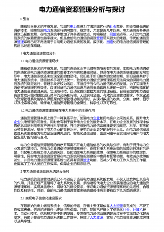 电力通信资源管理分析与探讨 0 引言 随着科学技术的不断发展,我国的电力系统为了满足现代化的社会需要,积极引进先进的通信技术,提高我国电力系统运行的可靠性、稳定性。尤其是近几年以来,电力通信设备更是得到迅猛的发展,在电力系统中增加了许多通信结点、传输基站、网络站点等,人们对电力通信系统的依赖程度也越来越大,但是也给电力通信的资源管理带来很大的难题。传统的通信资源管理系统已经不再适用于目前电力通信系统的发展,数字化、网络化的电力通信资源管理的构建已经迫在眉睫。 1 电力通信资源管理分析 1...
