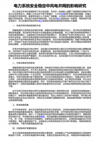 电力系统安全稳定中风电并网的影响研究 风力发电近年来在我国取得了很大的发展,并且在一定程度上缓解了我国煤炭资源的开采压力以及供电压力。随着人们生活水平的不断提升,人们对环境保护的意识越来越强。而通过对风电的开发和利用,能够有效减少火力发电厂的数量,从而减少对煤炭资源的消耗,促进我国的可持续发展。而在进行风电并网的时候,往往会对电力系统造成一些影响,导致电网不能正常运行,所以加强对风电并网对电力系统安全稳定的影响研究显得尤为重要。 一、风电并网对电网系统的冲击 根据我国风力发电的实际情况来看...