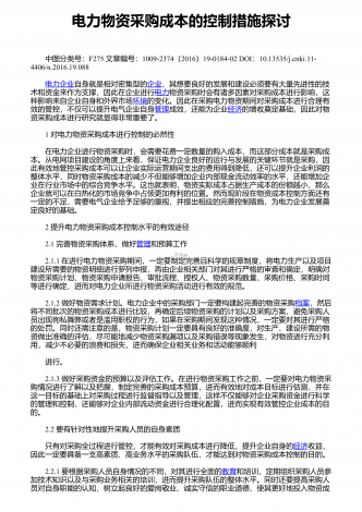 电力物资采购成本的控制措施探讨 中图分类号:F275 文章编号:1009-2374(2016)19-0184-02 DOI:10.13535/j.cnki.11-4406/n.2016.19.088 电力 企业 自身就是相对密集型的企业,其想要良好的发展和建设必须要有大量先进性的技术和资金来作为支撑,因此在企业进行电力物资采购时会有诸多因素对采购成本进行影响,这种影响来自企业自身和外界市场环境的变化。因此在采购电力物资期间对采购成本进行合理有效的管控,不仅可以提升电气企业自身管理成效,还...