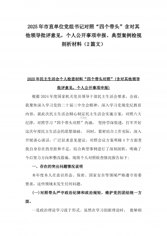 市总工会党组书记、市中级人民法院党组书记、院长2025年对照“四个带头”含个人情况、违纪行为为典型案例,举一反三剖析检视发言材料2篇文2025年市总工会党组书记民主生活会“四个带头”方面对照个人检查发言材料(附:上年度整改+个人情况)一、上年度民主生活会整改落实情况(一)学习贯彻习近平新时代中国特色社会主义思想方面。一是理论学习常态化。制定年度学习计划,组织党组理论学习中心组集中学习xx次,专题研讨xx次,深入学习习近平新时代中国特色社会主义思想,深刻领会党的创新理论的精髓要义,撰写学习心得xx...
