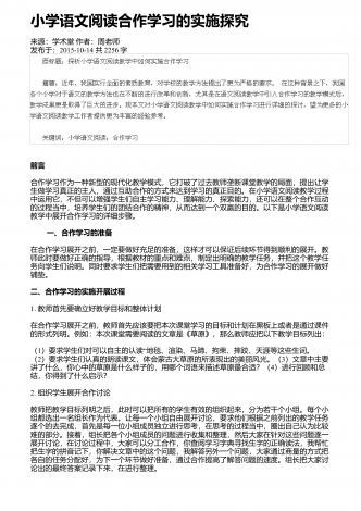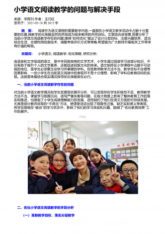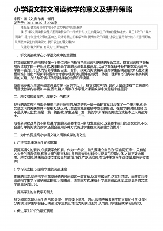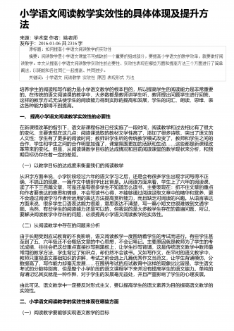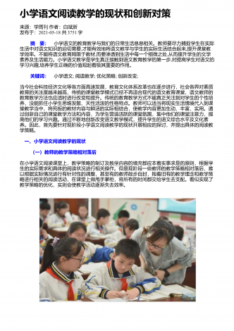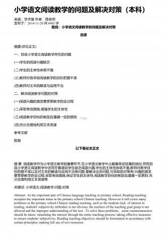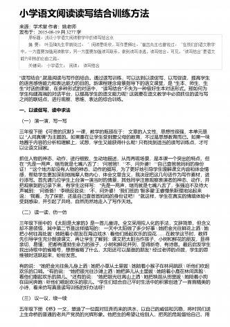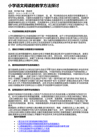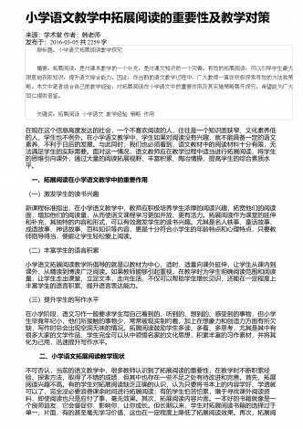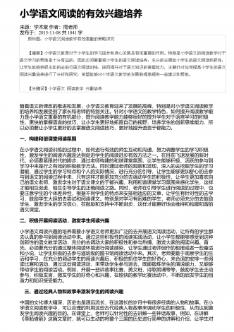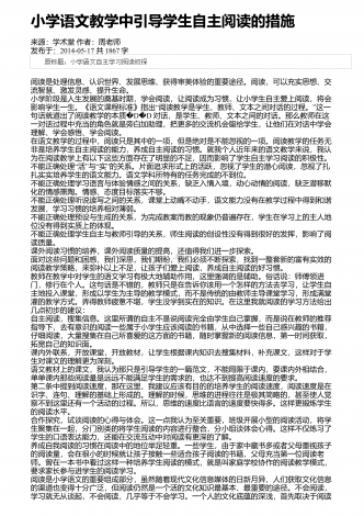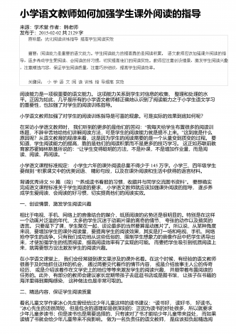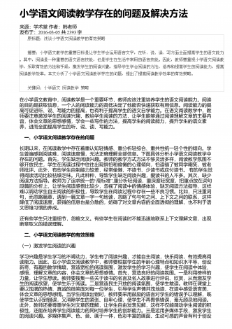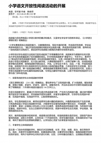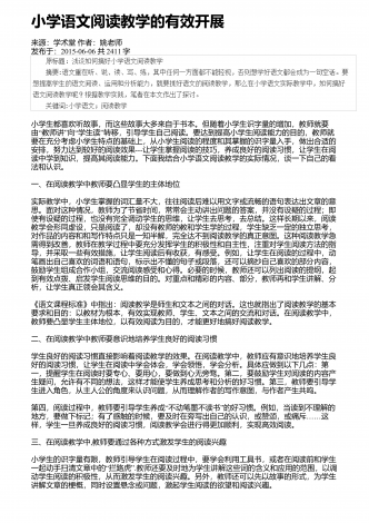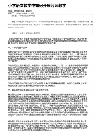 小学语文教学中如何开展阅读教学来源:学术堂作者:韩老师发布于:2015-07-18共2270字《语文课程标准》中指出:阅读是学生的个性化行为.阅读教学应引导学生钻研文本,在主动积极的思维和情感活动中,加深理解和体验,有所感悟和思考.受到情感熏陶,获得思想启迪,享受审美乐趣.由此可见,阅读教学在语文教学中具有举足轻重的作用.“”一、不动笔墨不读书徐特立曾经说过:“要想写出好文章,就要多读多写.多读,就是大量的阅读课外书籍,多写,就是要练习自己的笔头,肯于刻苦实践.”在阅读中,要做到不动笔墨不读书,...