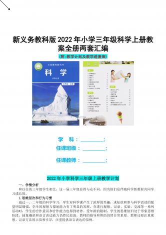 新义务教科版2022年小学三年级科学上册教案全册两套汇编(附:教学计划及教学进度表)学科:;任课班级:;任课教师:;2022年小学科学三年级上册教学计划一、学情分析和以往的三年级学生相比,这一届三年级显得与众不同,因为他们是伴随科学新教材共同学习成长的。1.思维层次和行为习惯通过一、二年级的科学学习,学生对科学课产生了浓厚的兴趣,求知欲和参与科学活动的愿望明显增强,学生的观察与描述能力有了明显的发展,在进行观察、记录、实验、交流等一系列活动时,学生的合作意识和合作能力也得到培养。受年龄的限制,学...