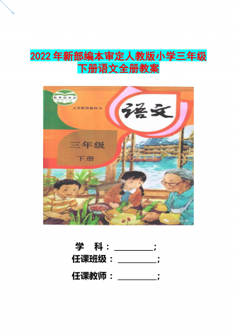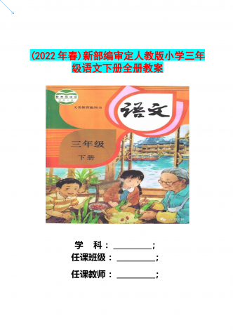 2022年新部编本审定人教版小学三年级下册语文全册教案学科:;任课班级:;任课教师:;1.古诗三首第一课时【课时目标】1.会认“鸳、鸯”2个字,会写“融、燕”等4个字。2.有感情地朗读课文,背诵课文。通过看注释,查字典,联系学过的古诗、成语,根据上下文和生活积累推测、判断重要字词的意思,从而完整地理解诗意。3.了解《绝句》的内容及诗中景物的季节特点,感受春天的美丽。【教具准备】教学课件【教学过程】一、导语激趣,简介作者 1.同学们,今天,我们来一起学习唐代大诗人杜甫的诗作《绝句》。师读:(课件...