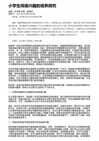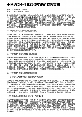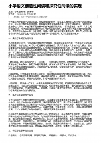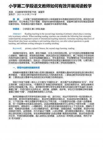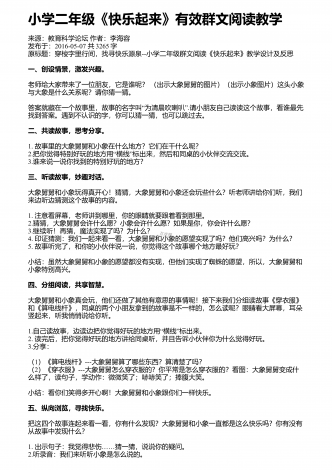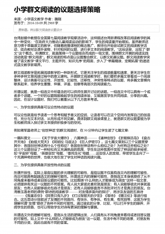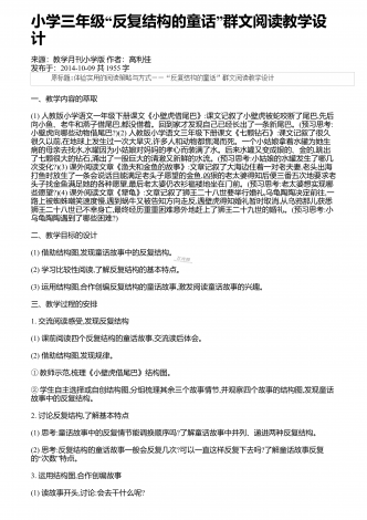 “”小学三年级反复结构的童话群文阅读教学设计来源:教学月刊小学版作者:高利佳发布于:2014-10-09共1955字一、教学内容的萃取(1)人教版小学语文一年级下册课文《小壁虎借尾巴》:课文记叙了小壁虎被蛇咬断了尾巴,先后向小鱼、老牛和燕子借尾巴,都没借着。回到家才发现自己已经长出了一条新尾巴。(预习思考:小壁虎向哪些动物借尾巴?)(2)人教版小学语文三年级下册课文《七颗钻石》:课文记叙了很久很久以前,在地球上发生过一次大旱灾,许多人和动物都焦渴而死。一个小姑娘拿着水罐为她生病的母亲去找水,水罐...