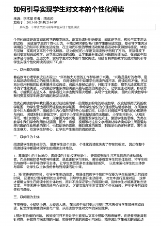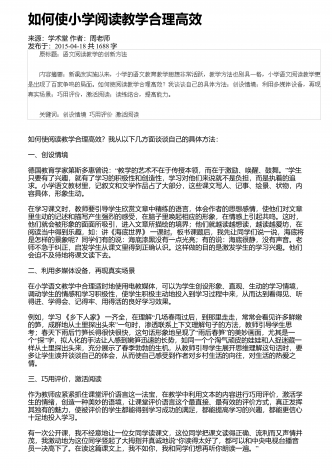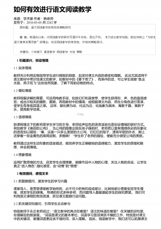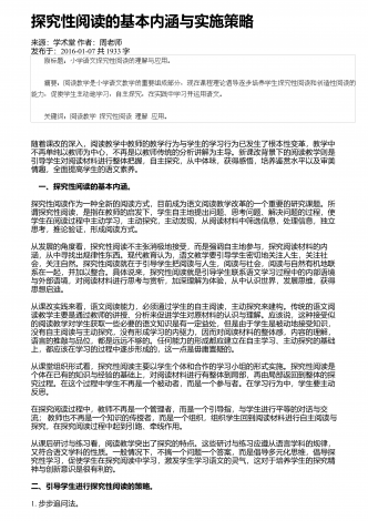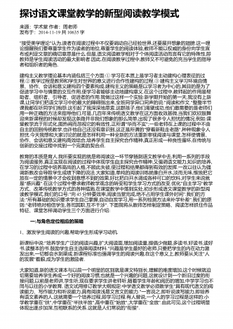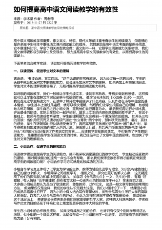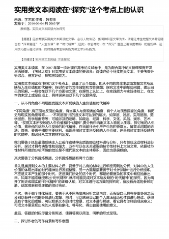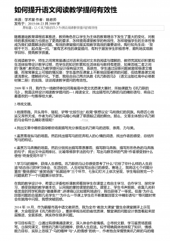 思辨性阅读在高中语文教学中的运用来源:语文教学通讯・D刊作者:郭建芬发布于:2019-03-04共2707字摘 要:思辨性阅读模式的应用作为高中语文教学改革的一项关键内容,直接关系着学生语文综合能力的全面提升。因此,教师应积极转变自身教学观念,敢于打破传统阅读模式的弊端,结合学生实际学习需求,合理运用思辨性阅读模式,充分调动学生学习的积极性,保障语文课堂良好的教学效果。 关键词:创新思维;理性思维;个性;有效性;在一个倡导创新的时代,高中语文阅读教学也要与时俱进,跟上时代前进的步伐。语...