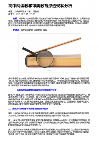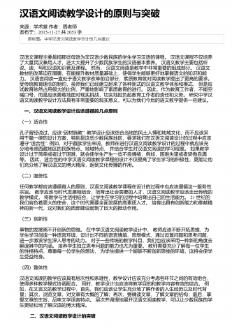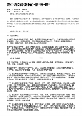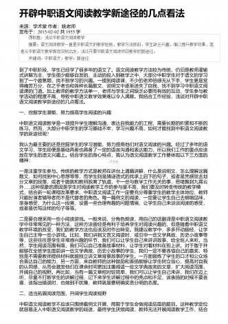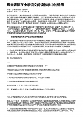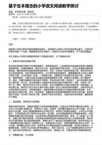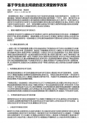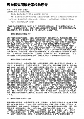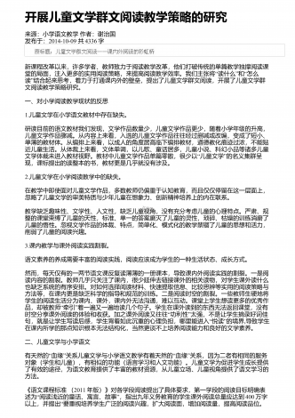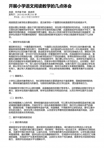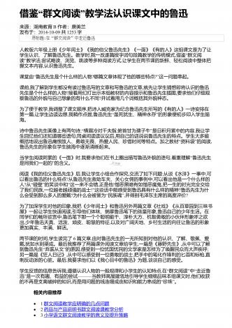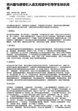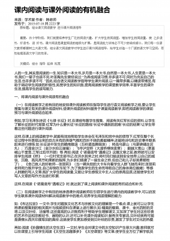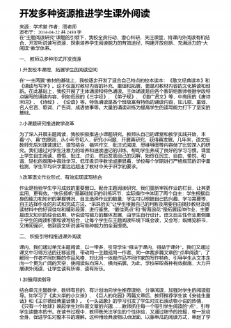 课内阅读与课外阅读的有机融合来源:学术堂作者:韩老师发布于:2015-07-18共2223字人的一生,其实是阅读的一生.知识是一本大书,岁月是一本大书,自然是一本大书,人生更是一本大书,我们一辈子也读不完.叶圣陶先生曾经说过:“为养成阅读习惯,非多读不可;同时为充实自己的生活,也非多读不可.”因此,结合语文阅读教学指导学生课外阅读,以一篇带多篇,以精读带博览,有助于调动学生阅读的积极性,拓宽学生的知识面,提高阅读教学的课堂教学效率,丰富学生的课外生活,提高学生的读写能力.一、将课内阅读与课外阅读...