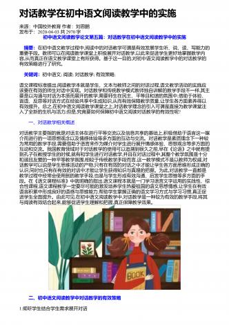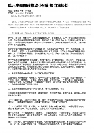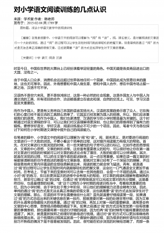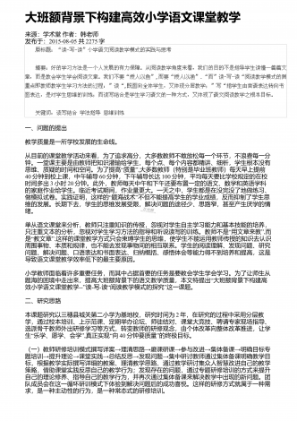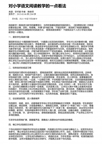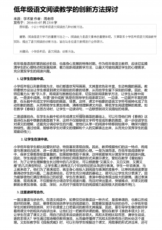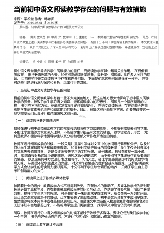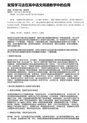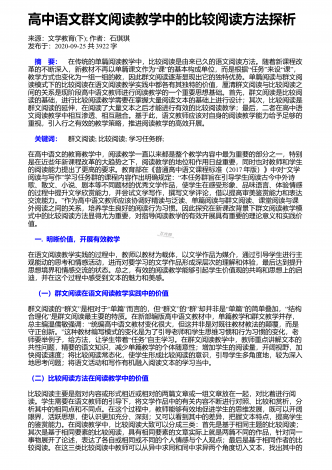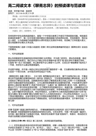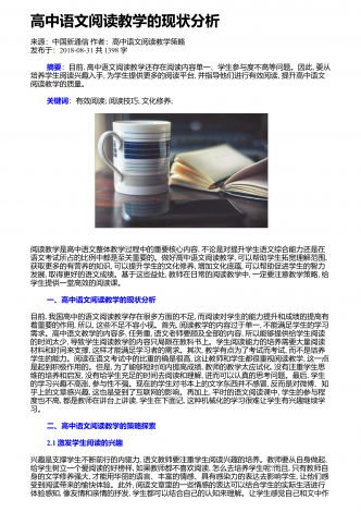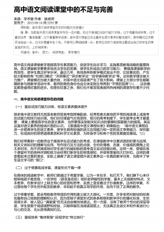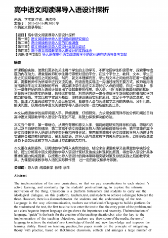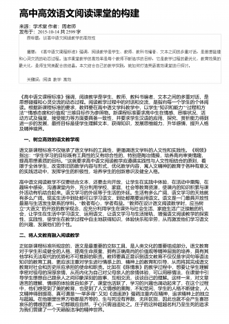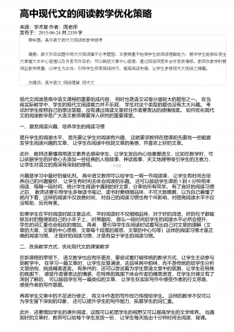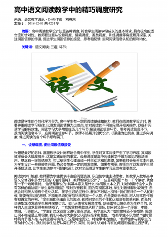 高中语文阅读教学中的精巧调度研究来源:语文教学通讯・D刊作者:刘尊东发布于:2018-12-01共4251字 摘要:高中阅读教学设计注重各种调度,符合学生阅读学习成长的基本诉求,具有极高的适合度和针对性。教师要注意从设悬调度、情境调度、鉴赏调度、训练调度等角度展开探索,关注阅读信息的传递,促进学生阅读信息的接受、思考和反馈,实现阅读信息认知的顺利内化。 关键词:语文阅读;三趣;环节;阅读是学生的个性化学习行为,高中学生有一定的阅读基础和能力,教师在阅读教学设计时,需要尊重阅读学习规律,以激发...