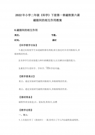 2022年小学二年级《科学》下册第一章磁铁第六课磁极间的相互作用教案6.磁极间的相互作用周次:节数:时间:课时【科学教学目标】1.通过实验使学生知道磁铁都有两极,相互接近时具有同极相斥,异极相吸的性质。2.培养学生的实验能力和归纳概括能力,以及解决问题的能力。3.激发学生爱科学、学科学、用科学的兴趣。【教学重难点】重点:通过实验研究磁铁同极相斥,异极相吸的性质。难点:通过实验研究磁铁同极相斥,异极相吸的性质。【器材准备】磁铁性质实验盒,红、蓝标签,铁架台,水槽【教学过程】一、导入:1.上次我们学...