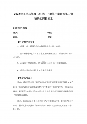2022年小学二年级《科学》下册第一章磁铁第三课磁铁的两极教案3.磁铁的两极周次:节数:时间:课时【科学教学目标】1、磁铁上磁力最强的部分叫磁极,磁铁有两个磁极。2、两个磁极接近,有时相互排斥,有时相互吸引。磁极间的作用是相互的。3、在观察中发现问题、提出问题,对问题作出假设性解释。4、通过实验获取证据,用证据来检验推测。【教学重难点】重点:鼓励学生设计不同的实验方案,研究磁性强弱的问题,从某方面对不同的实验方法做出比较和评价,体会同一问题可以用不同的方法解决。指导学生在探究活动中要注意收集数据...