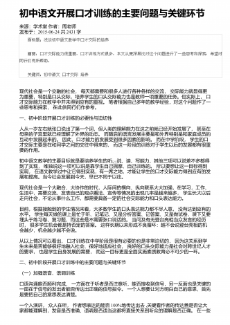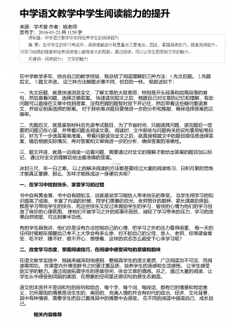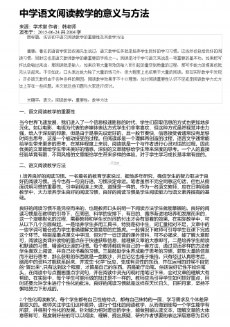 中小学语文阅读能力培养制约因素与对策来源:学术堂作者:姚老师发布于:2015-03-31共3450字《语文课程标准》指出:阅读是学生的个性化行为,阅读教学要充分尊重学生的个性,要把阅读活动变为学生自我探究,自我体验的活动,使学生在富于个性的阅读活动中,发展阅读能力,强化阅读体验,感悟阅读方法,提高阅读水平。阅读教学是中小学语文教学的中心环节,也是学生、教师与文本之间的交流过程,是学生陶冶情操、启迪智慧、培养能力、提高素养的一个重要环节。一、培养阅读能力的意义阅读是人类社会生活的一项重要活动,是人...