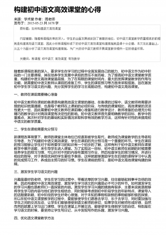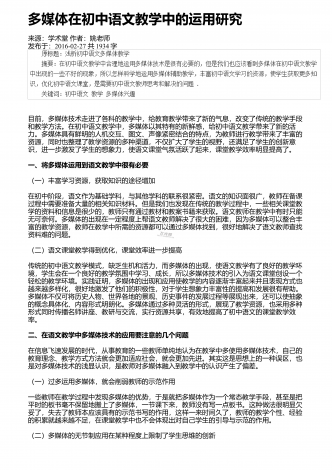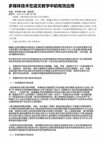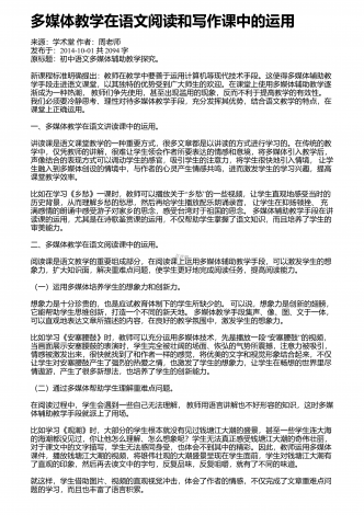 多媒体技术应用于语文课堂教学的意义来源:学术堂作者:周老师发布于:2014-10-08共2522字我国的素质教育实施已经有多年,已经逐渐成为课堂教学的主要模式.为了使课堂教学效果更加有效,多媒体技术正在逐渐走进课堂,受到广大师生的青睐.在信息技术高速发展的今天,把多媒体技术应用于语文课堂教学,对提高学生的学习积极性,增强学生学习的信心,吸引学生的注意力,激发学生的情感,提高学生的理解能力,挖掘学生的学习潜能,突破教学重难点,优化课堂结构,提高教学质量等多方面都起到了积极的作用.一、激发学生学习语...