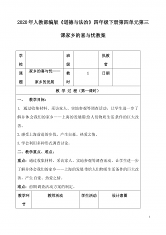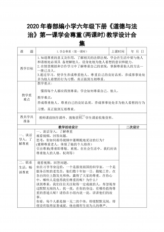 2020年春部编小学六年级下册《道德与法治》第六课探访古代文明第2课时教学设计6.探访古代文明教案课题6.探访古代文明(第二课时)上课时间年月日教学目标1.初步养成珍惜,领悟和传承古代文明遗迹的意识,宣传中国文化。2.初步理解珍惜古代文明遗迹的意义,初步学会探究古代文明成就。了解不同的文化,尊重文化多样性.3.用在情景体验、调查交流、创新展示的过程中,增强中华民族文化自信,宣传中国文化。4.初步感知古代文明成就,感受古代古代劳动者智慧。理解不同文化的特色,为中国文化走向世界而感到骄傲.教学重难点...