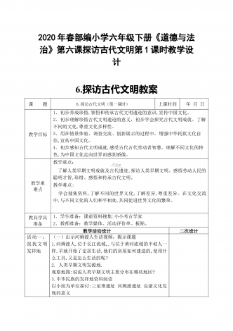 2020年春部编小学六年级下册《道德与法治》第六课探访古代文明第1课时教学设计